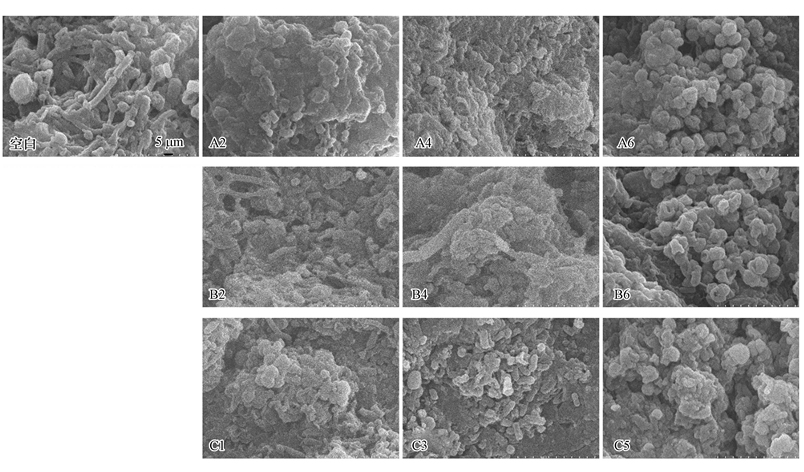 根據(jù)3.1節(jié)中的COD去除率變化選擇具有代表性的濃度組(A組:A2、A4、A6;B組:B2、B4、B6;C組:C1、C3、C5)進(jìn)行各項(xiàng)指標(biāo)的測(cè)定.圖 2為放大10000倍后的顆粒污泥的掃描電鏡圖.由圖 2可見,空白組厭氧顆粒污泥表面幾乎為8~25 μm長(zhǎng)的桿狀菌,伴隨有少量的球菌,污泥表面凹凸不平孔隙交錯(cuò),是內(nèi)部微生物能量代謝的重要通道.在高濃度的亞硝氮、硝氮和氨氮(A6、B6和C5)作用下,厭氧顆粒污泥的表面結(jié)構(gòu)都發(fā)生明顯變化,污泥表面的主要細(xì)菌由桿狀菌變?yōu)榍驙罹瑤缀醪灰姉U菌.低濃度抑制作用下,污泥表面主要細(xì)菌為桿菌和球狀菌,且與空白組相比桿菌比例明顯降低.