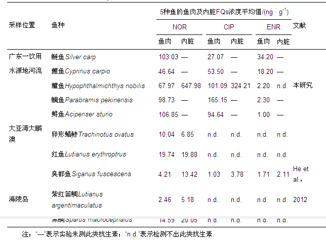 本研究測得5種魚的魚肉中的FQs含量均顯著高于大亞灣大鵬澳和海陵島中魚的FQs的含量;部分魚類魚肉和內(nèi)臟中NOR、CIP含量高于美國、歐盟的許多國家的殘留標準(殘留限量為30 ng · g-1),也高于我國農(nóng)業(yè)部標準NY 5070—2001《無公害食品水產(chǎn)品中漁藥殘留限量》的殘留標準(NOR、CIP殘留限量為50 ng · g-1).分析原因乃為同上,主要是養(yǎng)殖魚塘、禽畜養(yǎng)殖業(yè)、城鎮(zhèn)生活污水及感潮河流的滯留效應(yīng),導(dǎo)致面源污染嚴重,水體中可能含有較高的FQs含量.Li的研究表明FQs在可食用的軟體動物內(nèi)臟中性質(zhì)穩(wěn)定(Li et al., 2012);孫言春的研究也表明FQs在魚體內(nèi)吸收較快,消除較慢,F(xiàn)Qs在魚體內(nèi)富集作用較強.魚內(nèi)臟部位為代謝器官,因此,更易積累,造成魚內(nèi)臟中抗生素含量較高的現(xiàn)象.魚體內(nèi)臟中FQs含量多數(shù)情況下高于魚肉中FQs含量,這個結(jié)果與He的研究結(jié)果一致.