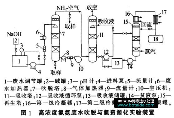 目前工業(yè)上采用傳統(tǒng)吹脫法處理高濃度氨氮廢水時,含氨吹脫氣常直接排放,易造成二次污染。筆者研制了一種新型可再生氨吸收液, 是由幾種無機和有機酸與助劑?水復配而成的酸性水溶液,pH≈4。其能高效吸收吹脫氣中的氨氣,生成不穩(wěn)定銨鹽;在加熱條件下,銨鹽分解釋放出氨氣,經(jīng)多級冷凝獲得較高濃度的氨水; 同時吸收液得到再生, 循環(huán)使用。