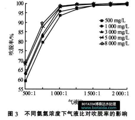 由圖3 可知,氣液比小于1 000∶1 時,不同氨氮濃度廢水的吹脫率均隨氣液比的增加顯著提高;但氣液比達到1 000∶1 時, 氨氮質(zhì)量濃度≥3 000 mg/L以上的廢水吹脫率可達95%以上; 繼續(xù)提高氣液比,吹脫率增加緩慢;而氨氮質(zhì)量濃度<3 000 mg/L的廢水吹脫率接近95%,繼續(xù)提高氣液比至1 500∶1后,吹脫率可達95%以上且增加緩慢。這表明,氣液比超過1 000∶1 后, 進水氨氮濃度對吹脫率影響不大。實驗中為獲得95%以上的吹脫率,應根據(jù)進水氨氮濃度將氣液比控制在(1 000~2 000)∶1 的范圍。