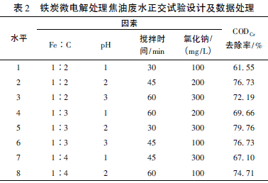 通過正交試驗,得到可以使CODCr去除率最高的最佳條件是: 鐵炭比為1∶3,pH值為2,氯化鈉投加量為200 mg/L,攪拌時間為45 min。在該條件下,焦油廢水的CODCr去除率最高,達到81. 26%。對于廢水的預(yù)處理來說,這樣的去除效果較為良好。