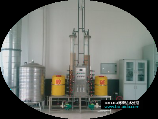 混床是指水依次通過裝有氫型陽離子交換樹脂的陽床和裝有氫氧型陰子交換樹脂的陰床的系統(tǒng)。氫型陽交換床用于除去水中的陽離子;氫氧型陰交換床用于除去水中的陰離子。通過復(fù)床可將水中的種礦物鹽基本除去。為了獲取較好的除鹽效果,陽床內(nèi)裝載強(qiáng)酸陽離子交換樹脂,陰床一般內(nèi)裝載強(qiáng)堿陰離子交換樹脂?;齑惨卜譃轶w內(nèi)同步再生式混床和體外再生式混床。