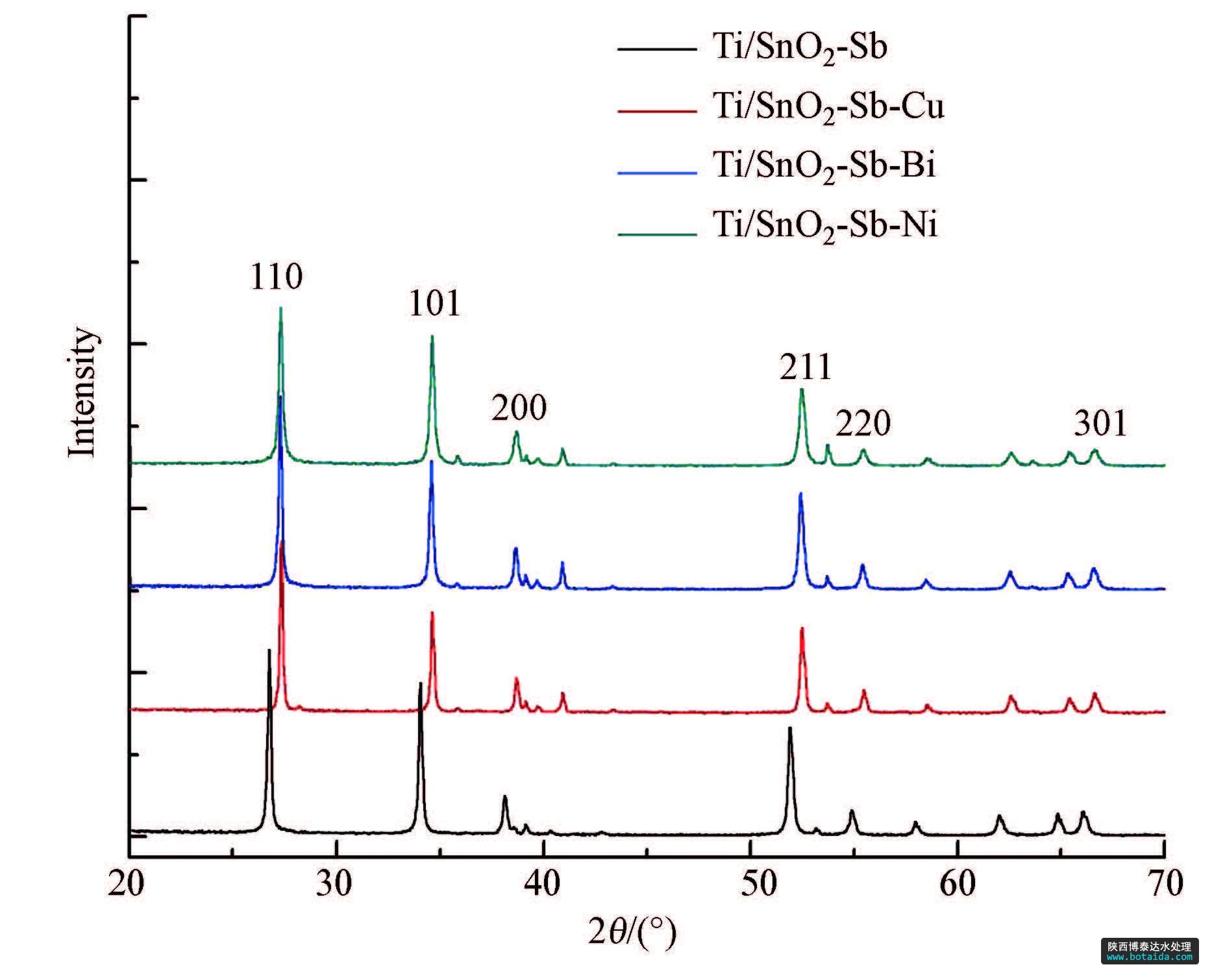 對所制備電極進行XRD分析.從圖 2數(shù)據(jù)可見,所有電極的X衍射峰的位置跟四方形金紅石型的SnO2晶體結(jié)構(gòu)的標(biāo)準(zhǔn)卡片(00-041-1445)的峰數(shù)據(jù)基本一致,并未檢測到Sb及摻雜金屬相應(yīng)氧化物的衍射峰,表明金屬摻雜并沒有改變SnO2晶體結(jié)構(gòu).這可能是因為金屬離子進入SnO2的晶格中取代了晶格中Sn4+的部分位置(李子榮和張雪梅,2006),以金屬氧化物的形式固溶到SnO2的晶格中,因而在XRD中Sb及摻雜的金屬沒有以單獨的氧化物形式存在.但是摻雜金屬后電極的X射線衍射峰位置發(fā)生了微小偏移,主要由于金屬離子與被替代的Sn4+之間離子半徑存在差異,以及金屬離子加入后出現(xiàn)的氧空穴而造成晶格缺陷.