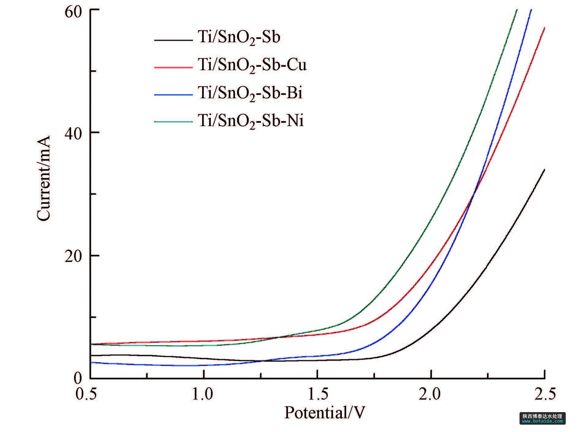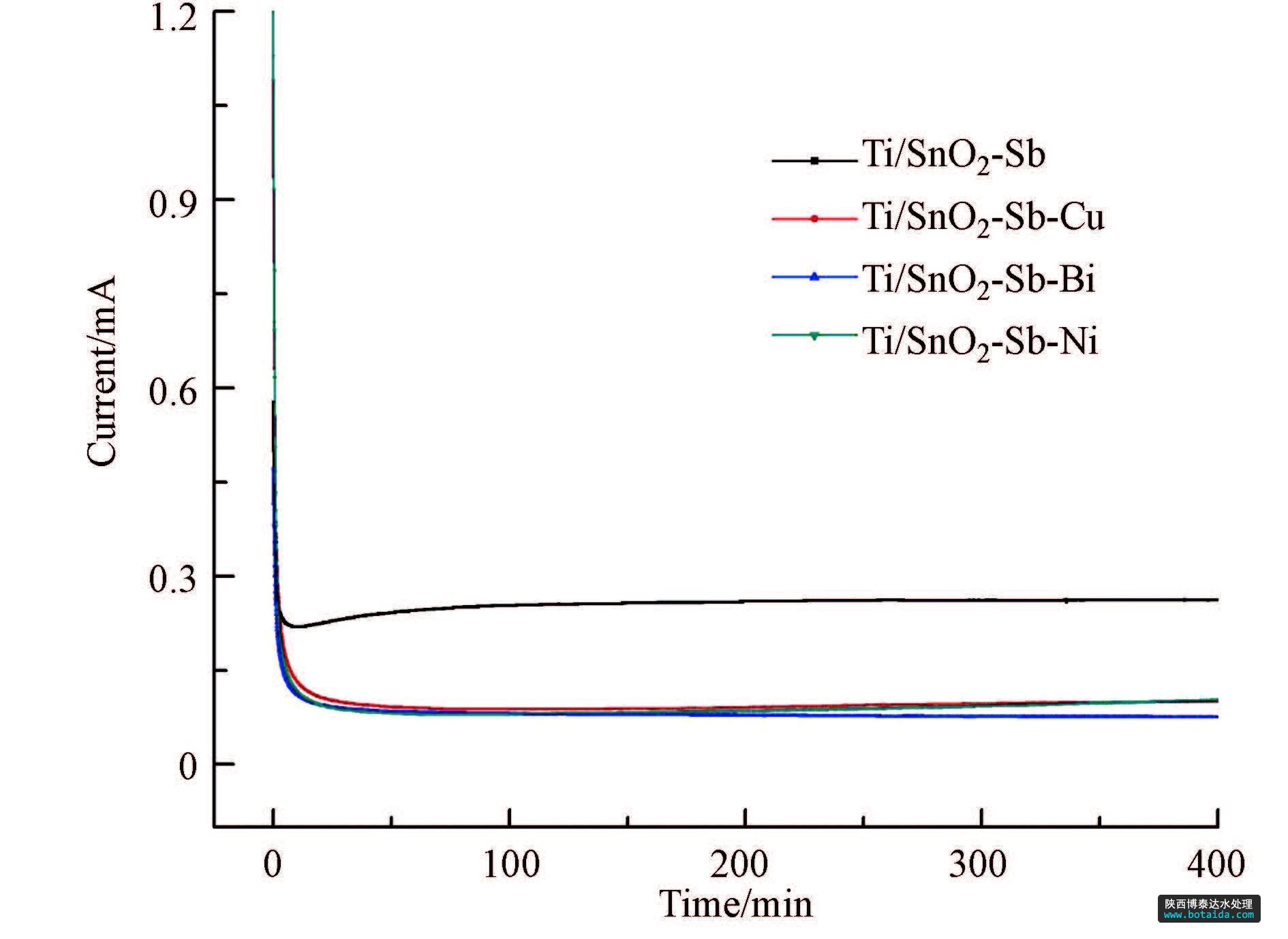 2)對各電極進行電化學(xué)性能測試得出:各電極的析氧電位均在1.7 V(vs.SCE)以上,處于較高的析氧電位,具有較高催化活性和電流效率;循環(huán)伏安測試發(fā)現(xiàn)摻雜Cu的改性電極具有最優(yōu)的催化活性;電極的電流-時間曲線表明,4種電極的氧化電流基本恒定,金屬摻雜改性后電極氧化電流明顯低于未摻雜電極,說明改性電極具有較高的穩(wěn)定性.