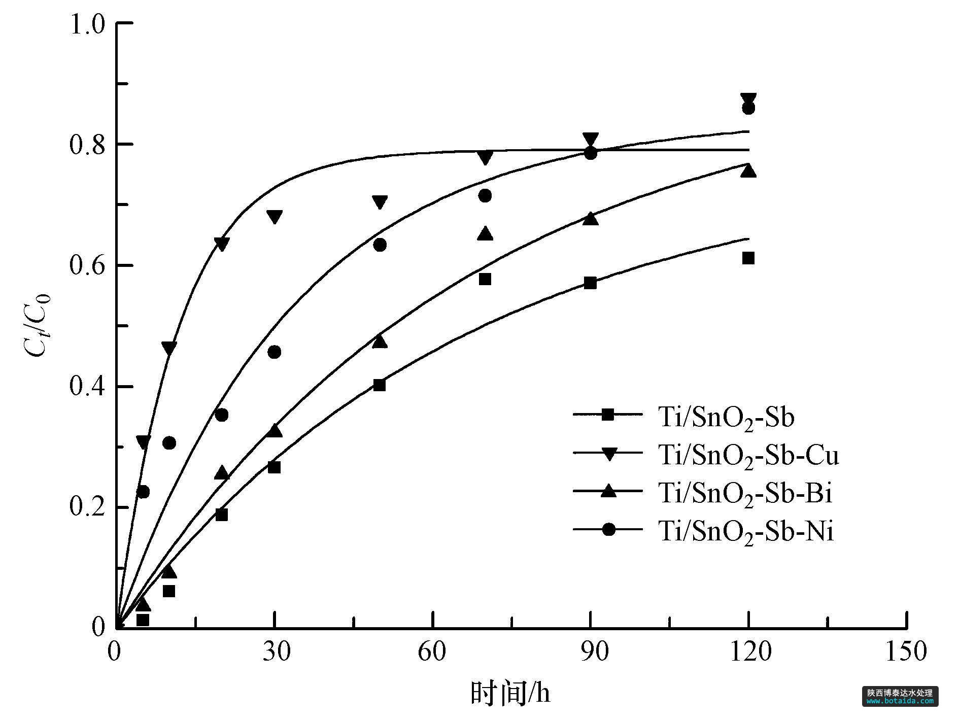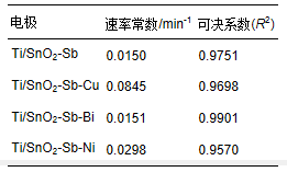 反應(yīng)速率常數(shù)越大說明有機物的降解速率越快,從表中可以看出在相同條件下,p-DCB在各電極上的反應(yīng)速率常數(shù)由大到小依次為KTi/SnO2-Sb-Cu,KTi/SnO2-Sb-Ni,KTi/SnO2-Sb-Bi,KTi/SnO2-Sb.因此p-DCB在Ti/SnO2-Sb-Cu電極上的降解速率最快,在Ti/SnO2-Sb電極上的降解速率最慢,可見金屬元素的摻雜對p-DCB的降解起到了促進作用。