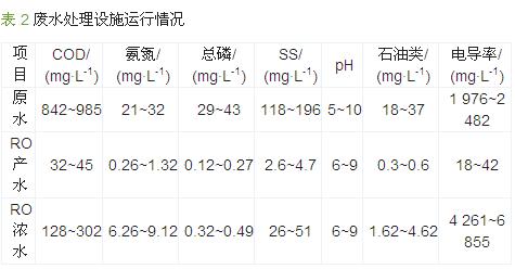 脫脂廢水、磷化廢水、噴漆廢水和電泳廢水等機(jī)械加工廢水的有機(jī)物濃度較高,且含有礦物油、懸浮物和氮磷等污染物。通過(guò)氣浮和混凝沉淀處理可將COD降低到700 mg/L左右,生物系統(tǒng)(缺氧和好氧工藝)可將COD降低到70 mg/L左右,出水可穩(wěn)定達(dá)標(biāo)排放。實(shí)際運(yùn)行時(shí)首先投加NaOH將廢水pH調(diào)至8.5~9.0,然后按照3、5、1.0 mL/L的投加量分別加入5%(質(zhì)量分?jǐn)?shù),下同)的CaCl2溶液、10%的聚合氯化鋁和5%的聚丙烯酰胺溶液,混合反應(yīng)60 min后進(jìn)入氣浮池,氣浮出水按6、1.5 mL/L投加量分別投加10%的聚合氯化鋁和5%的聚丙烯酰胺溶液,混凝沉淀出水最后進(jìn)入生物處理系統(tǒng),生化出水經(jīng)砂濾器、炭濾器、超濾、保安過(guò)濾器和反滲透深度處理后回用于生產(chǎn),反滲透濃水可達(dá)到GB 8978—1996三級(jí)標(biāo)準(zhǔn)。該工程已穩(wěn)定運(yùn)行4 a多,從實(shí)際檢測(cè)結(jié)果來(lái)看,反滲透產(chǎn)水COD穩(wěn)定在32~45 mg/L,電導(dǎo)率穩(wěn)定在18~42 μS/cm,可滿足生產(chǎn)用水水質(zhì)要求;反滲透濃水COD穩(wěn)定在128~302 mg/L,SS穩(wěn)定在26~51 mg/L,達(dá)到GB 8978—1996三級(jí)標(biāo)準(zhǔn)后達(dá)標(biāo)排放,其主要水質(zhì)指標(biāo)如表 2所示。