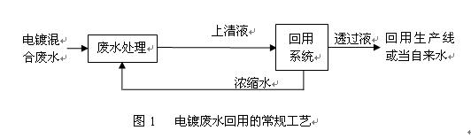 圖1是把所有電鍍廢水混合集中收集,先經(jīng)過(guò)物化或生物一系統(tǒng)處理,然后把上清液進(jìn)行膜系統(tǒng)回收,因在廢水處理過(guò)程中,投加了大量的PAC、PAM等,藥劑中含有大量的陽(yáng)離子物質(zhì)存在水中,很容易與回用膜元件表面電荷結(jié)合而堵塞膜元件,更不能保證很高的回收率,通?;厥章首罡邇H能達(dá)到50%,往往并不能保證長(zhǎng)期穩(wěn)定的運(yùn)行;因投加了大量的藥劑,使廢水的含鹽量也大大的增加,所以也降低了回用水水質(zhì);通過(guò)膜技術(shù)回用后的濃縮水重金屬通常會(huì)超標(biāo),不能直接排放,這樣只能回到廢水前處理系統(tǒng)中,從而增加了廢水處理部分的負(fù)荷及水量,嚴(yán)重影響廢水處理部分的效果,同時(shí)占地及土建投資也增大。