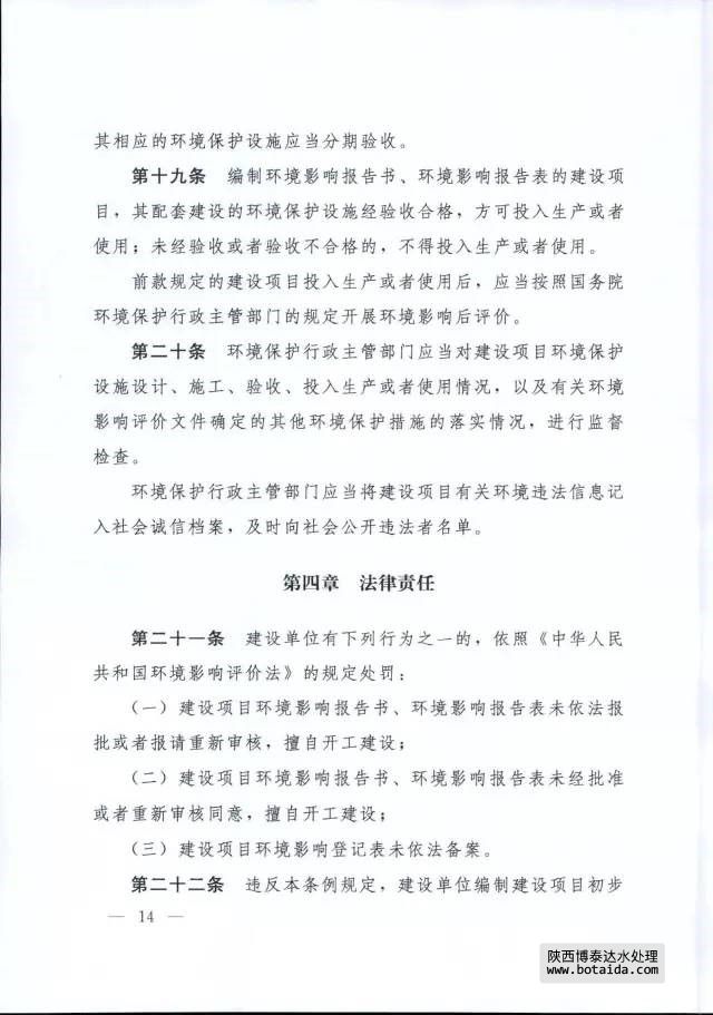 第十九條 編制環(huán)境影響報告書、環(huán)境影響報告表的建設項目,其配套建設的環(huán)境保護設施經(jīng)驗收合格,方可正式投入生產(chǎn)或者使用;未經(jīng)驗收或者驗收不合格的,不得投入生產(chǎn)或者使用。