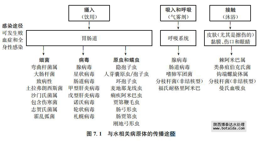能在自然環(huán)境中存在的其他病原體可能導(dǎo)致那些易感人群引發(fā)疾病,如老人或幼兒、燒 傷或有大面積創(chuàng)傷的病人、接受免疫抑制療法或是獲得性免疫缺陷綜合癥(艾滋病)患者。 如果這些人飲用或沐浴的水中含有足夠數(shù)量的這種病原體,就可引起各種皮膚和眼、耳、鼻、 喉黏膜感染。這些病原包括銅綠假單胞菌、黃桿菌屬、不動(dòng)桿菌、克雷伯氏菌、沙門氏菌、氣 單胞菌和某些“生長(zhǎng)緩慢”的非結(jié)核性分枝桿菌等(見(jiàn)附錄1支持文件《水中的病原分枝桿 菌》)。表7.2列出了一些這種生物體(更多詳細(xì)內(nèi)容請(qǐng)參見(jiàn)第11章)。