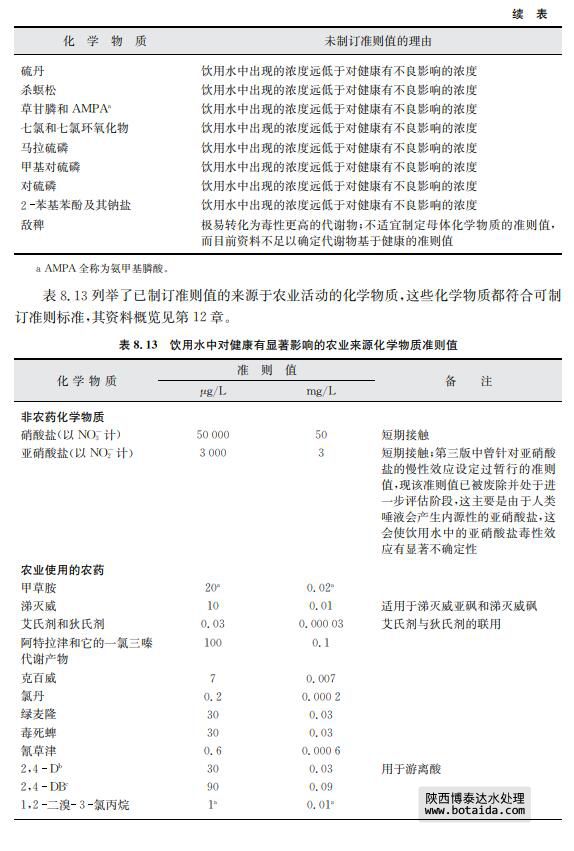 由于一些關(guān)于飲用水中存在化學(xué)物質(zhì)以及其穩(wěn)定性的文獻(xiàn)有明顯證據(jù)指出某些農(nóng)業(yè) 來源的化學(xué)物質(zhì)不會出現(xiàn)在飲用水中,對于此類化學(xué)物質(zhì)本準(zhǔn)則不考慮建立準(zhǔn)則值(見表 8.11)。