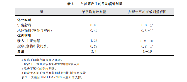 據(jù)聯(lián)合國輻射效應(yīng)科學(xué)委員會估計(UNSCEAR,2008),全球每人接受來自環(huán)境中所有 放射源的年平均劑量約為3.0mSv/年(物理量解釋見專欄9.1)。其中,80%(2.4mSv)來自 自然源,19.6%(接近0.6mSv)來自醫(yī)療診斷輻射,而剩下的0.4%(約0.01mSv)來自于其 他人工源(見圖9.1)。對于整個人群,每個人所接受的輻射劑量變化很大,取決于居住地點(diǎn)、 飲食規(guī)律和生活方式等因素。個人輻射劑量也可能因醫(yī)療暴露和職業(yè)暴露而不同。表9.1 列出了年平均劑量和天然來源個人輻照劑量的典型范圍(UNSCEAR,2008)。