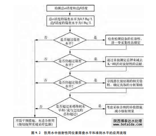 在本準(zhǔn)則的第二版中,根據(jù)總α活度和總β活度的篩查水平分別為0.1Bq/L和1Bq/L 確定了IDC為0.1mSv/年。這個IDC表示,自然放射源對年平均放射劑量貢獻(xiàn)不超過5% (見9.1節(jié))。事實上,后續(xù)的經(jīng)驗證明,如果總α活度低于或等于0.5Bq/L,那么總放射劑 量也通常不會超過0.1mSv/年。因此在第三版準(zhǔn)則中,犐犇犆基于總α活度和總β活度的篩 查水平分別為0.5Bq/L和1Bq/L,在本版準(zhǔn)則中,依舊沿用這一改變。