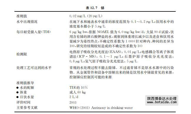 銻與銅、鉛和錫可合成硬質(zhì)合金。銻化合物有多種醫(yī)療用途,銻被認(rèn)為是可作為焊料的 鉛的替代品,但沒有任何證據(jù)證明由此而污染飲用水(見表12.7)。來自環(huán)境、食物和飲用水 方面的接觸相對于某些職業(yè)的接觸要低得多。