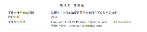 滅草松(CASNo.25057 89 0)是一種用于多種農(nóng)作物的廣譜除草劑。在土壤和水中 發(fā)生光降解作用,但在土壤中遷移性很強,在環(huán)境中的持久性屬中等程度。曾有報道表明地 表水、地下水和飲用水中發(fā)現(xiàn)滅草松的濃度為數(shù)微克每升或更少。盡管滅草松在地下水中 存在并與水體有很高的親和性,但它在環(huán)境中似乎并沒有蓄積性。滅草松來自食物的暴露 量不會很高(見表12.12)。