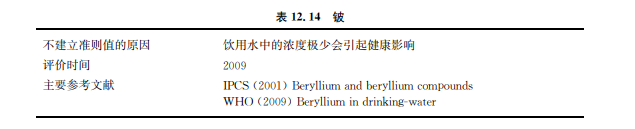 水中的鈹化合物主要來源于煤礦燃燒和其他使用鈹的工業(yè)釋放。地表水中鈹的其他來 源包括大氣中鈹的沉積和含有鈹的巖石和土壤的風化作用。鈹在自然水體中大多數情況都 在痕量水平(見表12.14)。鈹氧化物及氫氧化物在正常pH值范圍內難溶于水.