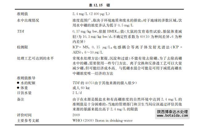 硼的化合物可用于制造玻璃、肥皂和清潔劑,并可用作阻燃劑。地下水中硼的天然來源 主要是由于含有硼酸鹽和硼硅酸鹽的巖石或土壤的浸出。地表水中硼含量會(huì)由于污水的排 入而增加,但這種作用的排污量以及污水中硼的平均含量已經(jīng)明顯減少(見表12.15)。