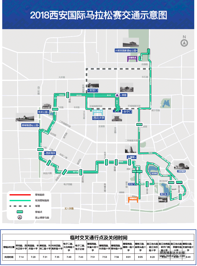 此次西安國際馬拉松的3項比賽起點均設(shè)在永寧門,為配合大賽舉辦,根據(jù)組委會要求,比賽當(dāng)日地鐵二號線永寧門站將延遲至上午10點開站,自地鐵運營開始至10時,列車在永寧門站不停站通過,前往永寧門站的乘客可從相鄰的鐘樓站或南稍門站進(jìn)出車站,由此給廣大乘客出行帶來的不便,請大家給予理解與支持。
