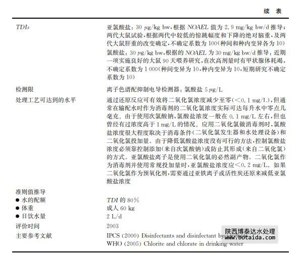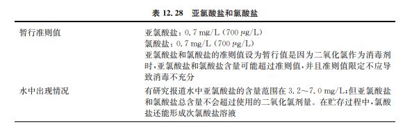 亞氯酸鹽和氯酸鹽是使用二氧化氯作為消毒劑或用于去除水中嗅味和異味的副產(chǎn)物 (見(jiàn)表12.28)。二氧化氯同時(shí)也用作纖維、紙漿、面粉和油類的漂白劑。亞氯酸鈉和氯酸鈉 用于制備二氧化氯以及其他商業(yè)用途。飲用水出水中,二氧化氯迅速分解成亞氯酸鹽、氯酸 鹽和氯化物離子,其中亞氯酸鹽是主要成分,該反應(yīng)在堿性條件下容易進(jìn)行。飲用水是接觸 環(huán)境中二氧化氯、亞氯酸鈉和氯酸鈉的主要途徑。氯酸鹽也會(huì)在儲(chǔ)存很久的次氯酸鈉溶液 中生成,特別是在高溫環(huán)境下。