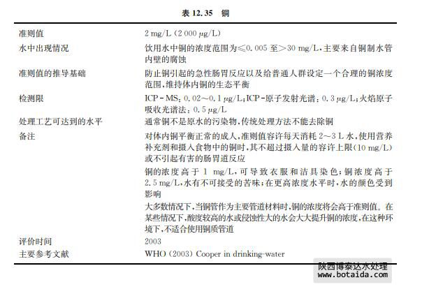 銅既是基本營(yíng)養(yǎng)元素,又是飲用水的污染物(見(jiàn)表12.35)。銅可用于制造管件、閥門(mén)和 配件,還可用于合成合金和鍍層。五水硫酸銅化合物有時(shí)會(huì)用于地表水中的藻類控制。飲 用水中銅的濃度范圍很廣。大多數(shù)情況,其主要來(lái)自銅制水管內(nèi)部的腐蝕。不過(guò)不斷流動(dòng) 的水或有壓流的水中銅的濃度往往較低。反之,在靜止的水或部分流動(dòng)水中銅的濃度變化 很大,最高濃度較高(經(jīng)常高于1mg/L)。在水輸送過(guò)程中,特別是輸水系統(tǒng)中處理過(guò)的水 呈酸性或含高濃度碳酸鹽而呈堿性的水中,往往會(huì)使銅的溶解增加,濃度升高。發(fā)達(dá)國(guó)家中, 食物和水是銅的主要暴露源。在使用裝有銅水管或接頭的管網(wǎng)系統(tǒng)中,水流經(jīng)常靜止或部分 流動(dòng)條件下,可以大大增加每日銅的攝入量,特別是嬰兒人工喂奶時(shí)用自來(lái)水調(diào)配的奶。
