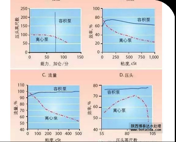 總的來說,在粘度超過150 cP時,必須能夠在較廣范圍內(nèi)預(yù)測流量,或者在希望泵機能夠自行起動灌注時,可以考慮選用容積泵。在離心泵與容積泵之間進行選擇時,還要考慮到能耗問題,因為這兩種泵在能耗方面可能會存在著相當(dāng)大的差別。這一點對于流量低于100加侖/分的情況是特別重要的,在這種情況下,離心泵工作效率的下降幅度會更大。