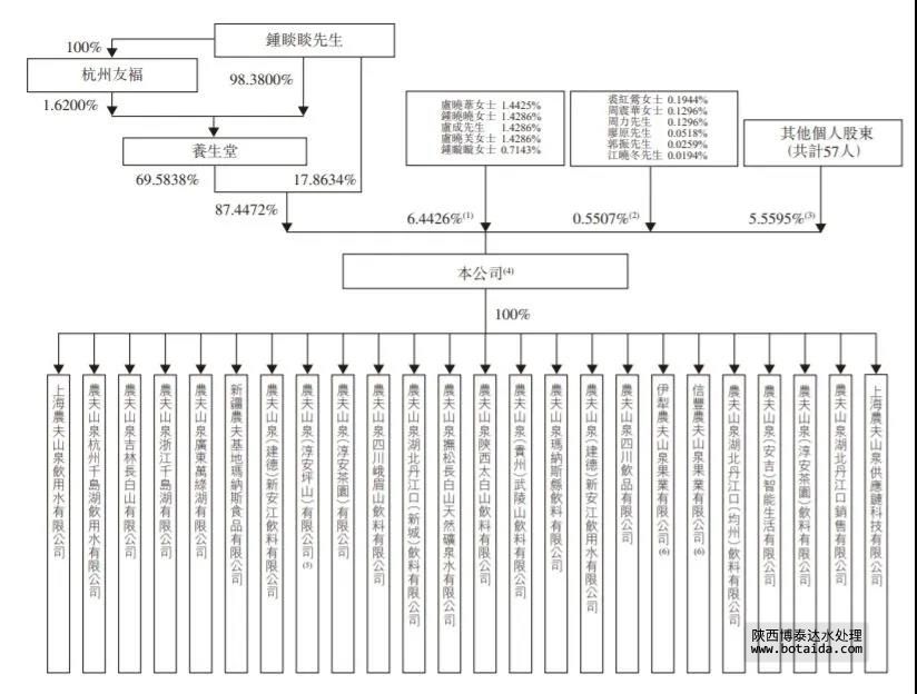 農夫山泉上市后總股本大約為118.9億股,鐘睒睒通過旗下公司持股84.4%,從下圖可見,鐘睒睒持股高度集中,上市前沒有引入PE等機構,也沒有聯(lián)合創(chuàng)始人、高管分享其股權。
