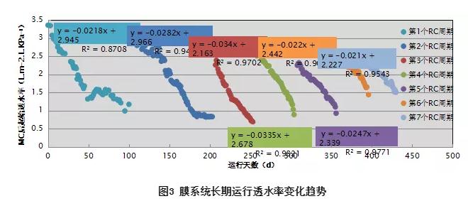 ① 透水率穩(wěn)定性透水率(J25/△P)是衡量膜滲透性能的主要指標(biāo)。以透水率隨運(yùn)行時間的衰減速率作為膜系統(tǒng)運(yùn)行穩(wěn)定性的評價指標(biāo),方法是:通過線性擬合分析得到每次維護(hù)性清洗(MC)后的起始透水率,再將每個恢復(fù)性清洗(RC)周期內(nèi)的起始透水率進(jìn)行線性回歸得到每個RC周期內(nèi)的透水率衰減速率,見圖3。