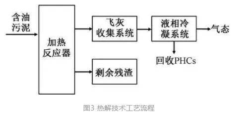 在無氧條件下,含油污泥經(jīng)高溫?zé)峤廪D(zhuǎn)化為氣、液、固三相,氣相產(chǎn)品以CH4、CO2、H2和CO為主,液相一般為常溫燃油和水,固相殘?jiān)泻薪固浚话阋曰厥找簯B(tài)PHCs為主,可不調(diào)質(zhì)達(dá)到回收目的。熱解反應(yīng)在還原氣氛下進(jìn)行,產(chǎn)二噁英極少,其典型工藝流程如圖3所示。