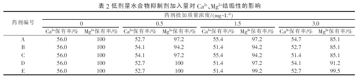 為驗證低劑量水合物抑制劑對油田污水結垢性的影響,按表1 配制強結垢型的油田污水,并添加質(zhì)量分數(shù)為0.5%~3%低劑量水合物抑制劑進行試驗,結果見表2?試驗表明,對于具有較強結垢趨勢的油田水質(zhì),加入水合物抑制劑后,Ca2+的保有率比空白稍有下降,但不顯著,即水合物抑制劑的加入對油田污水碳酸鈣垢的沉積不會造成太大的影響?除了E外, 隨著A~D 水合物抑制劑用量增加,Mg2+的保有率有不同程度的下降, 表現(xiàn)出對油田污水中Mg2+的沉積有一定的促進作用?