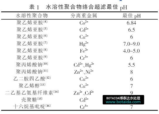 由表1 可以看出,水溶性聚合物絡(luò)合超濾的最佳pH 一般偏中性或弱堿性, 但也有些最佳pH 呈弱酸性,這是由水溶液中的金屬離子的水解作用所致?
