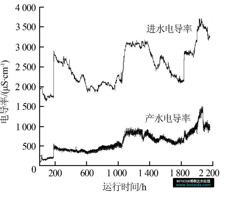 從圖4可以看出,在試驗(yàn)前1 000 h內(nèi),產(chǎn)水電導(dǎo)率在500 μS/cm左右,到試驗(yàn)后期產(chǎn)水電導(dǎo)率基本維持在1 000 μS/cm上下。
