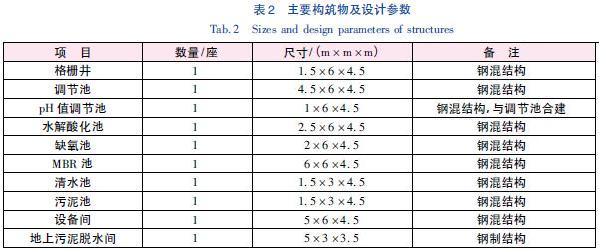 廢水先通過機(jī)械格柵除去較大的固體懸浮物。從格柵井流出廢水泵入調(diào)節(jié)池,以均勻水質(zhì),緩解水力沖擊負(fù)荷對后續(xù)工藝的影響。調(diào)節(jié)池出水進(jìn)入水解酸化池,水解酸化池出水依次進(jìn)入缺氧池和MBR 池,缺氧池的主要作用是進(jìn)行反硝化脫氮,從而去除廢水中的氨氮。MBR 集膜的高效分離和生物降解于一體,是將污水生物處理技術(shù)與膜分離技術(shù)相結(jié)合的新型污水處理工藝。其用膜組件代替了傳統(tǒng)活性污泥工藝中的二沉池,可進(jìn)行高效固液分離,達(dá)到水凈化的目的,克服了傳統(tǒng)工藝中出水水質(zhì)欠穩(wěn)定、污泥易膨脹等不足。生物反應(yīng)器內(nèi)保持較高的污泥濃度,硝化能力強(qiáng),污染物去除率高,部分混合液回流至缺氧池進(jìn)行反硝化去除氨氮。MBR 池出水進(jìn)入到清水池進(jìn)行消毒后,出水可回用或達(dá)標(biāo)排放。主要構(gòu)筑物尺寸及設(shè)計參數(shù)見表2。