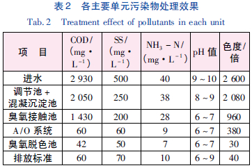本工程經(jīng)過近2 個(gè)月的調(diào)試運(yùn)行后,出水水質(zhì)穩(wěn)定,COD 總?cè)コ蕿?8.6%,達(dá)到設(shè)計(jì)要求。各單元的處理效果見表2。