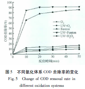量取300 mL 廢水,調(diào)節(jié)其pH=4 分別采用O3、UV/O3、Fenton(28 mL H2O2、1.6g FeSO4·7H2O) 、UV-Fenton(28 mL H2O2、1.6g FeSO4·7H2O) UV/H2O2(2 mL H2O2) 氧化體系處理廢水50 min,并分別在0、10、20、30、40 和50 min 取樣,中止反應(yīng),測定處理后廢水的COD,其COD 去除率隨時(shí)間的變化如圖5 所示。
