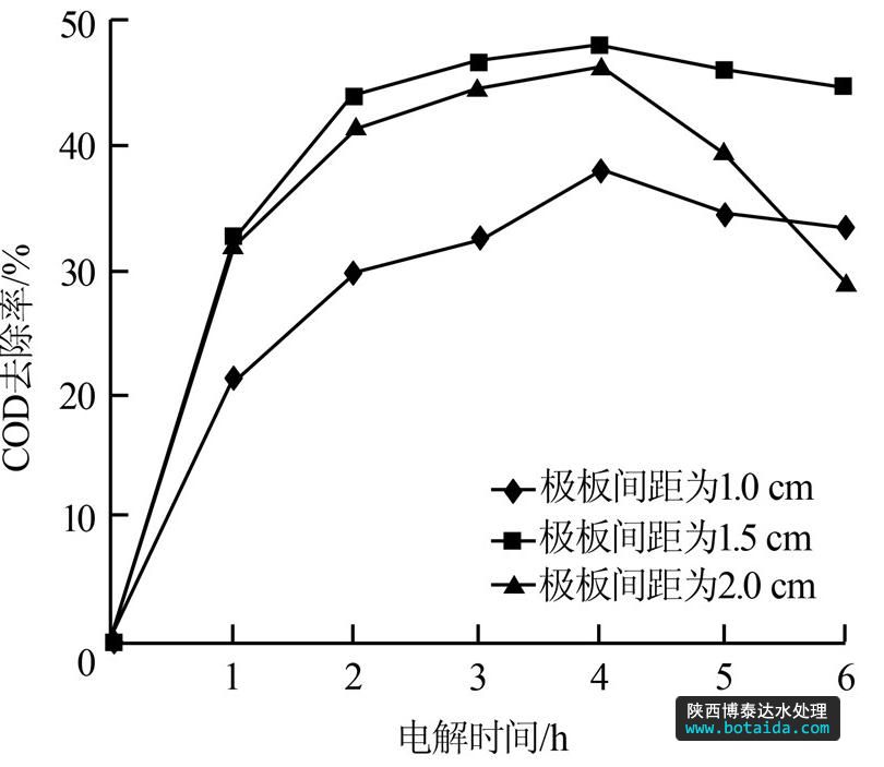 (3)調(diào)節(jié)極板間距至1.5~2.0 cm對提高垃圾滲濾液的COD去除率有利。過小的極板間距會(huì)產(chǎn)生短路現(xiàn)象,過大則會(huì)降低去除效果。