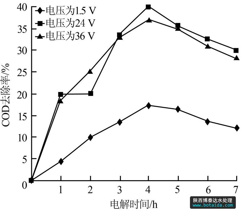 圖 4 外加電壓為1.5、24、36 V時(shí)COD去除率的變化