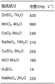 維生素成分:維生素B1 5 mg · L-1、維生素B2 5 mg · L-1、維生素B6 10 mg · L-1、維生素B12 0.1 mg · L-1、維生素H2 mg · L-1、對(duì)氨基苯甲酸 5 mg · L-1、硫辛酸 5 mg · L-1、煙酸 5 mg · L-1、葉酸 2 mg · L-1、泛酸 5 mg · L-1.