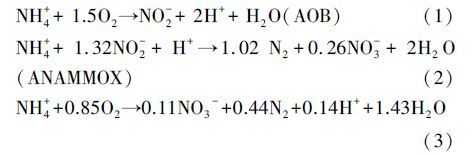 CANON(Completely Autotrophic Nitrogen Removal over Nitrite,CANON)工藝是一種新型的生物脫氮工藝,其脫氮原理為:氨氧化菌(Ammonia-Oxidizing Bacteria,AOB)利用溶解氧(Dissolved Oxygen,DO)將NH4+-N氧化成NO2--N,厭氧氨氧化菌(Anaerobic Ammonium Oxidation,ANAMMOX)利用AOB提供的基質(zhì)和創(chuàng)造的缺氧環(huán)境對(duì)NH4+-N和NO2--N進(jìn)行轉(zhuǎn)化從而實(shí)現(xiàn)脫氮.反應(yīng)過程如下:
