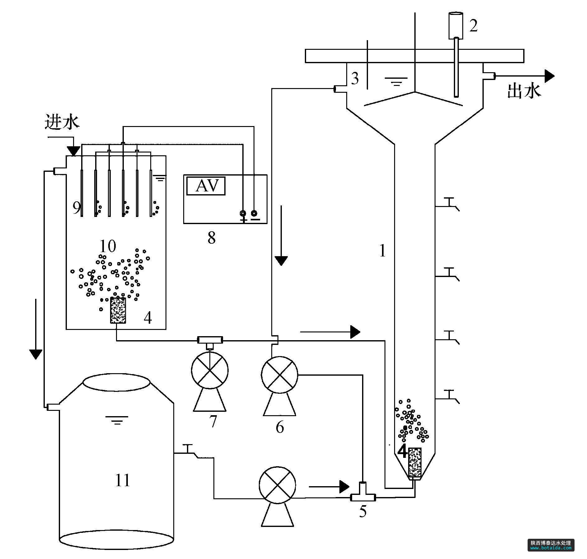 圖1 電絮凝-CANON工藝裝置示意圖(1.EGSB,2.溶解氧儀,3.溫度計(jì),4.曝氣頭,5.三通,6.蠕動(dòng)泵,7.空氣泵,8.電源,9.鋁板,10.電絮凝反應(yīng)器,11.調(diào)節(jié)池)