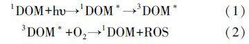 溶解性有機(jī)質(zhì)(DOM)含有發(fā)色基團(tuán),是重要的天然光敏劑,在紫外輻射或太陽光照射下,單線態(tài)(state DOM singlet,1DOM)分子吸收光能先轉(zhuǎn)化為激發(fā)單線態(tài)(excited state DOM singlet,1DOM*),進(jìn)而轉(zhuǎn)化為激發(fā)三線態(tài)(excited state DOM triplets,3DOM*),進(jìn)一步與溶解氧分子發(fā)生一系列反應(yīng),產(chǎn)生活性氧物質(zhì)(reactive oxygen species,ROS),如羥基自由基(hydroxyl radical,· OH)、單線態(tài)氧(singlet oxygen,1O2)、超氧化物(superoxide,O2-)等(見反應(yīng)式(1)、(2.這些活性氧物質(zhì)可以誘導(dǎo)有機(jī)污染物光降解,同時,DOM也會與目標(biāo)化合物競爭光吸收,或猝滅目標(biāo)化合物的激發(fā)態(tài),DOM對有機(jī)污染物的光解具有光敏化和光屏蔽雙重作用(Chen et al., 2009;,這與DOM的來源、組成、化學(xué)結(jié)構(gòu)等特點密切相關(guān).因此,溶解性有機(jī)質(zhì)在水生生態(tài)系統(tǒng)光化學(xué)中扮演重要角色,可以影響有機(jī)污染物的環(huán)境行為和生態(tài)風(fēng)險.