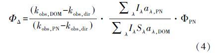 式中,Iλ表示光源在每個波長下的光照強(qiáng)度(W · m-2);aλ,DOM和aλ,PN分別表示腐殖酸和光敏劑在每個波長處的納氏吸收系數(shù)(m-1),可由公式(5)計算得到;Sλ是屏蔽因子,無量綱,可由公式(6)計算得到.