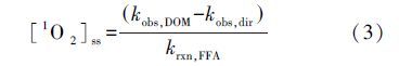 一般采用單線態(tài)氧平衡濃度(singlet oxygen steady-state concentrations,[1O2]ss)對腐殖酸產(chǎn)生1O2的產(chǎn)量進(jìn)行表征.FFA作為對1O2的捕獲劑,其降解的快慢可以反映產(chǎn)生1O2的速率.[1O2]ss可由FFA降解速率常數(shù)kobs,DOM和FFA自身光降解速率常數(shù)kobs,dir經(jīng)公式(3)計算得到.