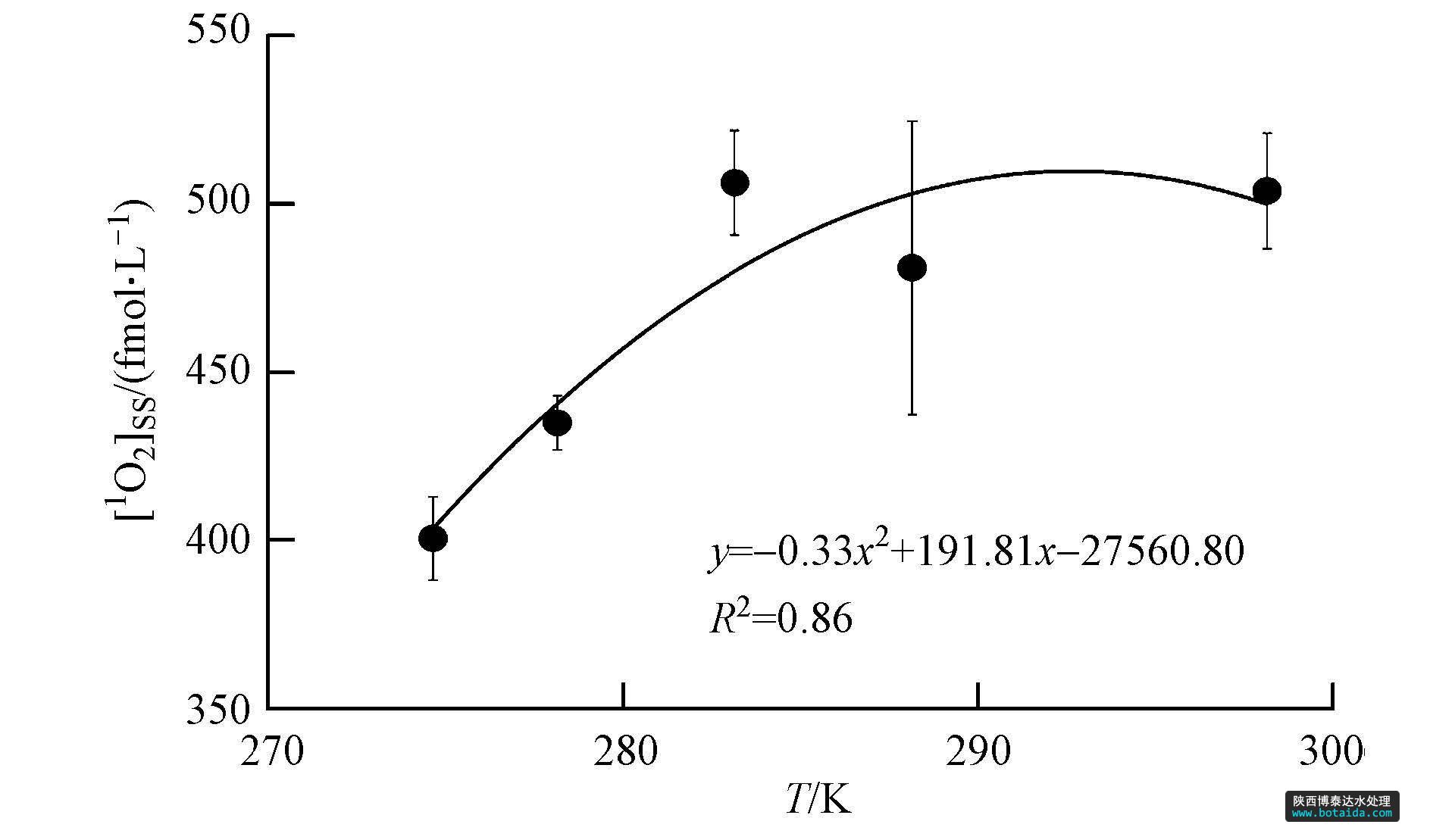 為模擬實際水環(huán)境,本研究所選溫度段為1.5、5、10、15和25 ℃,[1O2]ss與T(T為絕對溫度)的關(guān)系如圖 4所示.實驗溫度范圍內(nèi),[1O2]ss值為400~506 fmol · L-1,隨T增大呈增長趨勢.分析推測溫度升高,溶液中分子活躍度增強(qiáng),使得HA吸收光子能量發(fā)生能級躍遷生成三線激發(fā)態(tài)(3HA*)的速率增大,使得更多的氧分子獲得3HA*轉(zhuǎn)移的能量形成1O2.
