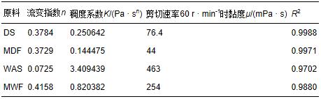 根據式(2),測定不同轉速條件下的原料黏度,由冪律方程擬合得到4種發(fā)酵原料的流變特性參數(shù),如表 1所示.流變指數(shù)n是衡量實際流體與牛頓流體相似程度的指標.當n為1時,此時流體為牛頓流體;n小于1時,流體為假塑性或者剪切變稀流體;n大于1時,流體為膨脹塑性或者剪切增稠流體.從表 1中可以看出,4種原料的流變指數(shù)n都小于1,在 TS 為 5%、溫度為35 ℃條件下都為假塑性流體(陳志平等,2004).造成這4種原料呈現(xiàn)明顯的假塑性流體性質的原因可能是污泥主要由微生物聚集體(即活性污泥菌膠團)、廢水帶入的無機性沉渣、少量未降的有機物等大分子物質和大量的水分組成,污泥混合液中大分子物質的存在會使原料在受到剪切后發(fā)生分子的重排,分子趨向與流動方向一致,流動阻力下降,從而使表觀黏度在剪切速率增大時減小(劉刈等,2009).4種原料中WAS的流變指數(shù)最小,剩餐的最大,這說明在 TS 為 5%、溫度為35 ℃條件下4種原料中MWF的流變性質最接近牛頓流體,而WAS偏離牛頓流體的程度最大.此外,4種原料中MDF的黏度最小,WAS的黏度最大,而流體稠度系數(shù)作為黏度的量度,使得通過擬合的得到的4種原料的流體稠度系數(shù)中MDF最小,WAS最大.