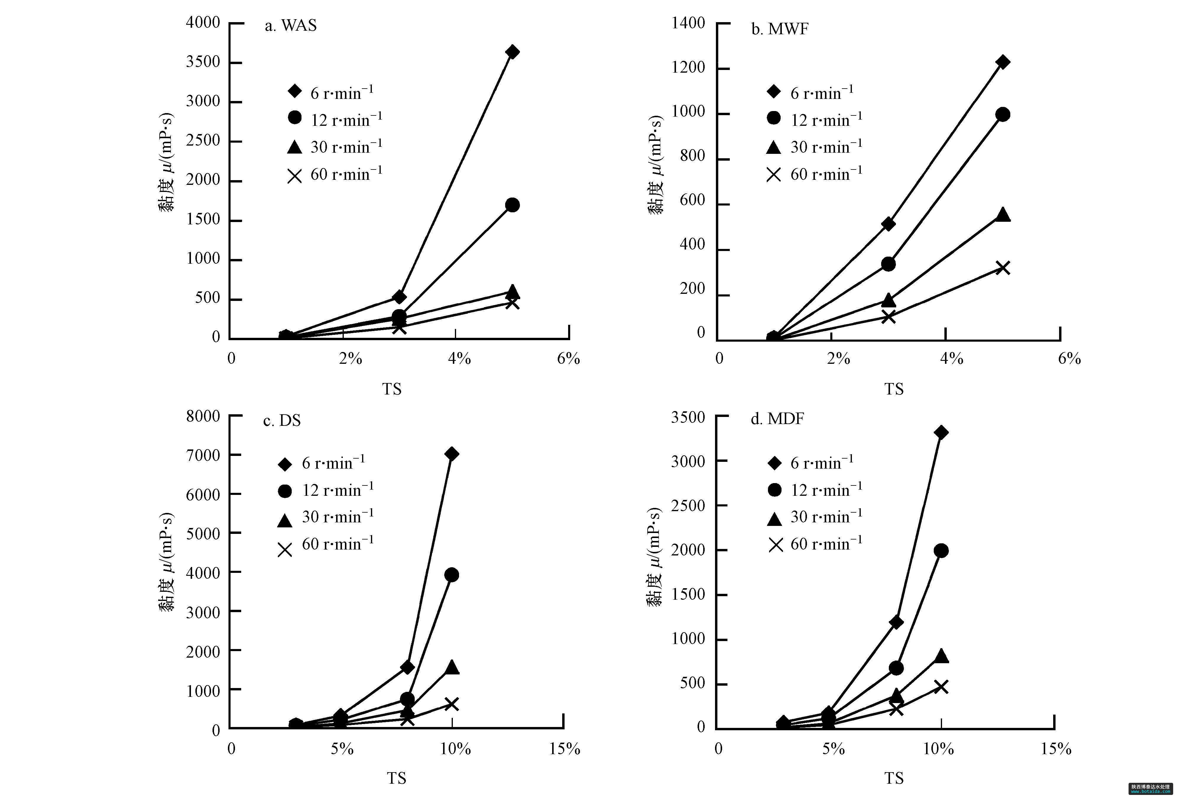 由圖 2可以看出在60 r · min-1剪切速度下添加餐廚垃圾后的MWF和MDF的黏度較相應的純泥而言都有所降低,一方面可能是由于餐廚垃圾的含水率較原泥的含水率低,在配制混合液時會加入更多的水稀釋,從而導致黏度的降低;另一方面通過對TS為3%、5%、8%濃度的餐廚垃圾進行黏度的測量,發(fā)現(xiàn)黏度值均在50 mPa · s以下,因此推測將一種很低黏度的流體混入相對較高黏度流體后,可能會使得混合液黏度變小.在TS為5%時,DS和MDF的黏度明顯小于WAS和MWF.本課題組前期試驗結果顯示,在TS為5%濃度下分別對MWF和MDF進行聯(lián)合厭氧發(fā)酵實驗,MDF與MWF混合厭氧發(fā)酵平均日產氣量分別為411.5 mL · L-1 · d-1、256.2 mL · L-1 · d-1,MDF厭氧發(fā)酵日產氣量是MWF的1.6倍.MDF比MWF的產氣性能好,這可能跟MDF的黏度較低,便于物料與反應器中基質和微生物混合有關.由圖 2還可以看出,DS和MDF的黏度在TS=1%到TS=8%的濃度區(qū)間內變化較為緩慢,但當TS從8%增長到10%時,物料的黏度急劇增大,因此對于高濃度物料的消化系統(tǒng)而言,如果物料不進行預處理,TS=8%是一個較為利于厭氧消化的濃度條件.