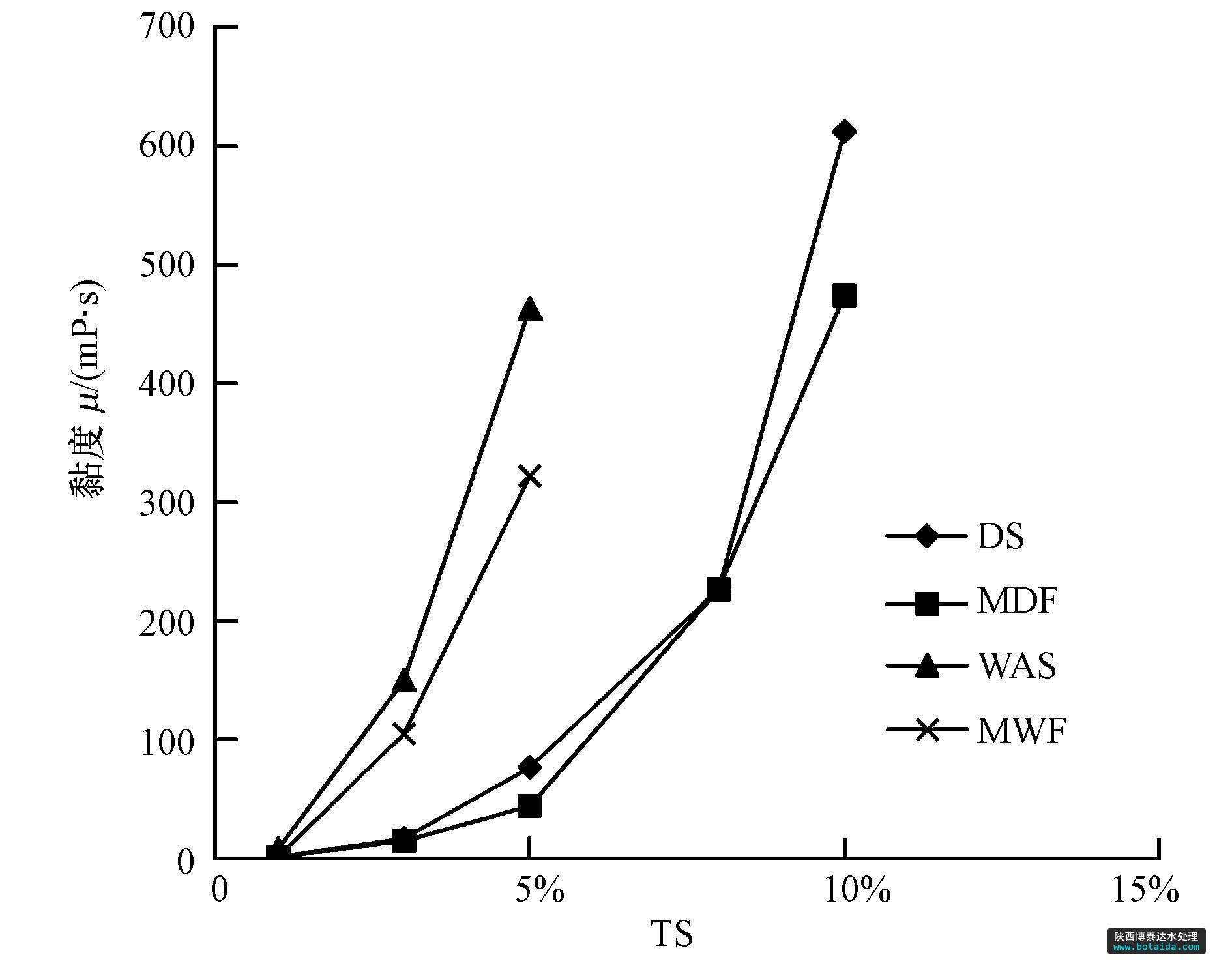 根據原料的起始 TS濃度,用蒸餾水分別將DS、DS與餐廚垃圾按TS 4 ∶ 1混合的混合物(the mixture of dewatered sludge and food waste,以下簡稱MDF)配制成TS濃度分別為1%、3%、5%、8%和10%的混合液裝于500 mL 燒杯中;用恒溫水浴鍋控制混合液溫度為35 ℃,樣品經過攪拌之后,用旋轉黏度計(NDJ5-S,中國上海)測量 4 個攪拌轉速(6、12、30、60 r · min-1)下的黏度,待讀數(shù)基本穩(wěn)定時,每10 s 讀數(shù)1次,共讀取7個黏度值,取算術平均值.