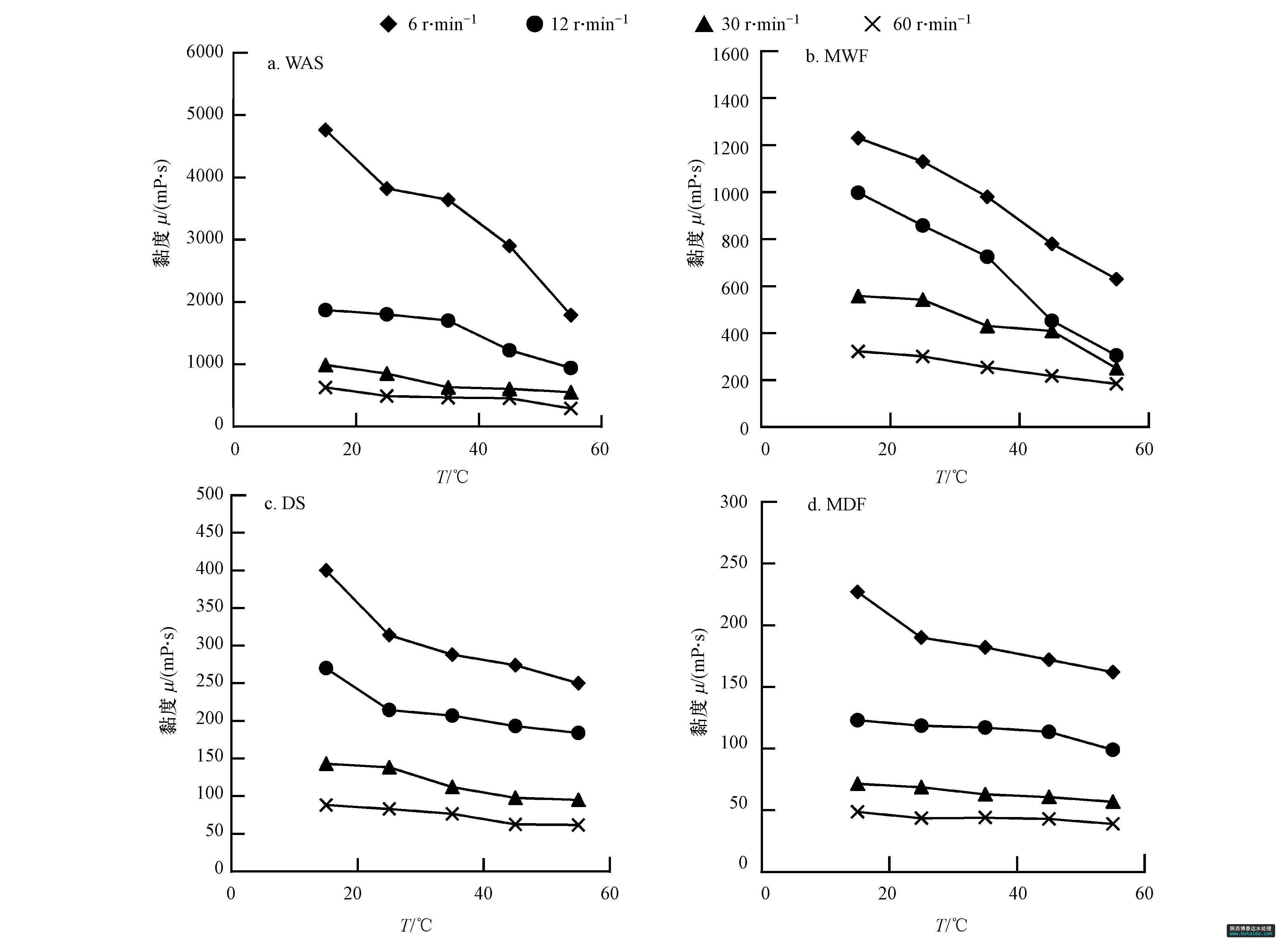 圖4 4種原料黏度隨溫度的變化(TS=5%)