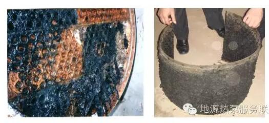 1)防堵塞。未處理原生污水中含有大尺度懸浮物,包括纖維狀的發(fā)絲類、紙屑類、藻狀類,普通的換熱設(shè)備是根本無法承受的。而實踐證明:已處理污水和地表水中的懸浮物含量相對較少,盡管與未處理原水不在同一數(shù)量級,但隨著運行時間增長,堵塞問題也立即突現(xiàn),原水的堵塞時間為1~3d,而地表水則為7~10d。圖4是未處理原生污水的堵塞現(xiàn)象,圖5是已處理污水的堵塞狀況。