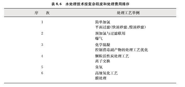 ?        不同水處理工藝按其復(fù)雜程度和處理費用的定性排序如表8.6所示,次序越高,工藝或 運營越復(fù)雜。