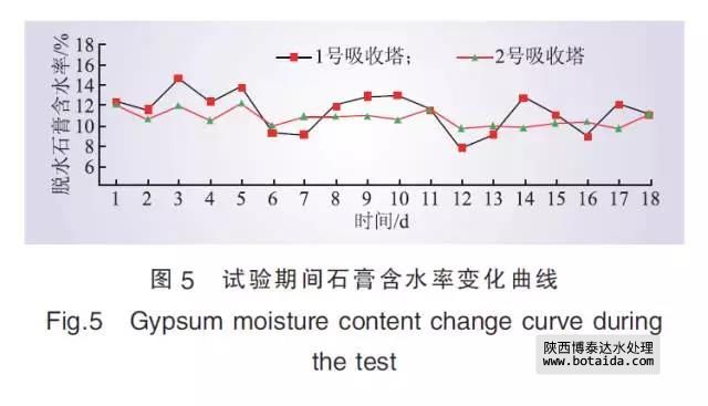 由圖3—7可以看出, 試驗(yàn)期間, 雖然混入處理后的工業(yè)廢水量不斷加大, 但脫硫系統(tǒng)漿液密度均能維持在1 130 kg/m3左右, 且脫硫效率仍然大于或等于95%; 脫硫副產(chǎn)品石膏品質(zhì)未發(fā)生明顯變化, 石膏的含水率基本保持在10%, 石膏中CaCO3質(zhì)量分?jǐn)?shù)小于3%, CaSO4· 2H2O純度大于90%, 符合商用石膏品質(zhì)要求。此外, 試驗(yàn)期間除霧器壓差處于正常運(yùn)行范圍之內(nèi), 吸收塔沒有發(fā)生起泡、堵塞等不正?,F(xiàn)象。試驗(yàn)結(jié)果表明, 處理后的工業(yè)廢水可用作脫硫工藝水。