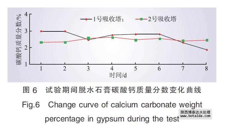根據(jù)計劃進(jìn)行臨時管路系統(tǒng)安裝, 從原工業(yè)廢水系統(tǒng)清水池清水泵出口母管直接引出一路管道至1、2號脫硫塔間的地坑。由電廠原有的坑泵將處理后的工業(yè)廢水輸送入脫硫塔工藝用水點(diǎn), 同時在管路上增設(shè)電動調(diào)節(jié)閥和電磁流量計。首次補(bǔ)入地坑120 m3處理后的工業(yè)廢水, 待地坑內(nèi)坑泵開啟將其輸送至脫硫系統(tǒng)后, 監(jiān)測脫硫塔脫硫效率、石膏品質(zhì)變化; 在脫硫塔脫硫效率、石膏品質(zhì)穩(wěn)定無變化的情況下, 逐步補(bǔ)入處理后的工業(yè)廢水, 并以10 m3/d的梯度逐漸增加。若石膏品質(zhì)明顯下降, 則加大監(jiān)測頻率, 分析原因, 同時停止補(bǔ)入處理后的工業(yè)廢水。在調(diào)試好相關(guān)設(shè)備和儀表后開始進(jìn)行試驗(yàn)分析, 內(nèi)容包括脫硫系統(tǒng)整體運(yùn)行狀況、脫硫效率、石膏品質(zhì)等。
